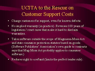- Publishers can charge customers for support. They can do that today, but under current law, the customer sometimes has a right to reimbursement of "incidental expenses" that are caused by a defect. Calling to report the defect is an example of an incidental expense. Under Article 2, contracts can say that the seller will never reimburse incidental expenses, but a court can reject this if the customer didn't know about the restriction before the sale or if the charge is unreasonable under the circumstances. The judge is instructed to give a customer a "minimum adequate remedy" in the face of a true breach of contract. UCITA fixes this for publishers, makes remedy exclusions fully enforceable, and rejects the notion of the minimum adequate remedy. Under UCITA, if I sell you a computer game for $50 that has a known defect that gives you a problem installing it, I can charge you $5 a minute for telephone support. If you give up after 20 minutes, having spent $100 on the call, you can get a refund all right. You send me back the program, I send you back $50, but I keep your $100. I don't know of any other American law that allows sellers to profit from their known