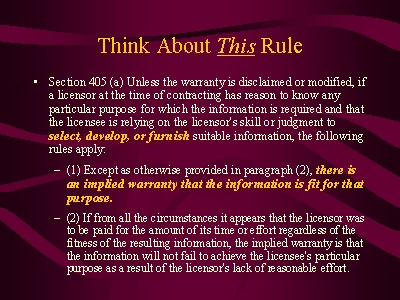 Similarly, we have a new rule that says that if you select, develop or furnish software for a customer who relies on your judgment, you are making an implied warranty that the software is fit for the customer's use.