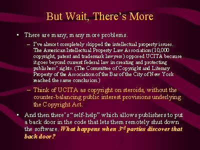 UCITA is worse than this. It is like a copyright act on steroids, granting publishers enormous power without the constraints of public interest that the United States Constitution imposes on the federal copyright act.