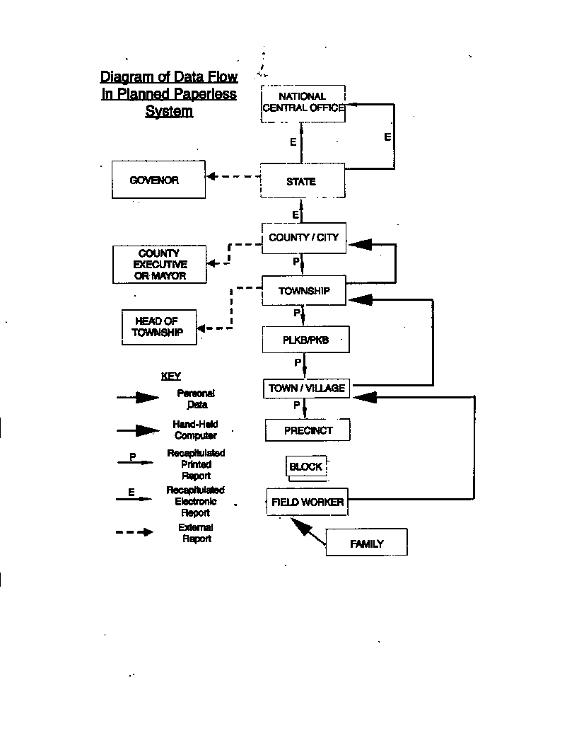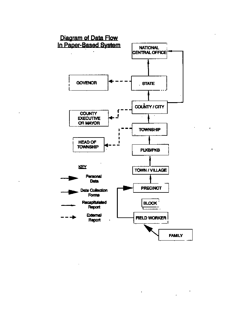 All data are collected on large and complicated paper forms during an interview with a family by a fieldworker. After completing interviews with their assigned families, the field workers send their forms to the precinct where BKKBN employees summarize data for each block in the precinct. This first recapitulation removes all personal identification and individualized information from the process. The information is then condensed again and again as it moves up through each level until it is entered into the computer at the county or city level. The following illustrates the flow of data through the hierarchy: